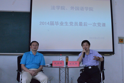 本次活动中,刘大炜和赵云鹏两位老师结合毕业生的发展为同学们上了最后一次党课。刘大炜在他的讲话中主要针对毕业生如何在工作中成为赢家谈了几点自己的看法和经验,他指出,丰富的专业知识于工作是很必要的,但理论毕竟要运用到实践中去,因而实践经验也很重要;此外还应该有很强的工作责任意识和过硬的思想观念和价值观;最后他强调,在拥有极强的业务能力外,为人处事的方式也必须加以注意。赵云鹏则在讲话中提到,要成为一个优秀的人才天赋固然重要,但后天的努力更加不可缺少,在享受生活的同时还应不断提升能力、提高素质、完善人格,与此同时还要把握好机会才能走向成功;除此之外,还应该注意工作中以及在与人相处中的各种细节,因为细节往往会决定成败。