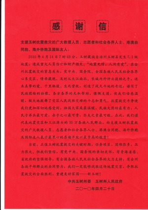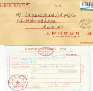 2010年4月14日,青海省玉树县发生7.1级强震后,我校08级全国政法干警招录培养体制改革试点班党支部第一时间倡导发起的募捐活动,党支部指导教师、辅导员王家启老师以及40多位学员慷慨解囊,筹集到2181.55元善款。按照全体学员共同的心愿,在紧急联系青海省玉树抗震救灾指挥部后,于4月20日通过农行将这笔凝结着法大学子的爱心的善款电汇至玉树州财政局救灾专户,希望切实能够为帮助灾区人民渡过难关尽一份微薄但却坚实的力量。近日,收到中共玉树州委、玉树州人民政府的感谢信以及玉树州财政局出具的捐款发票。