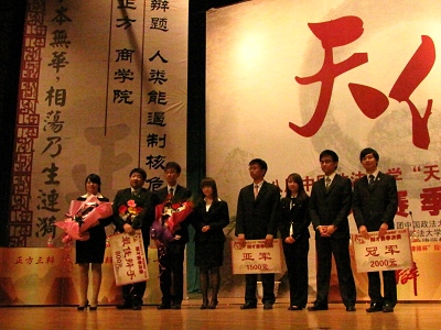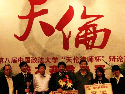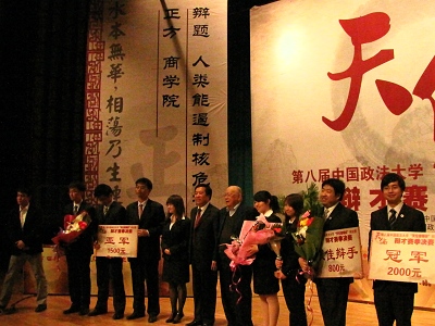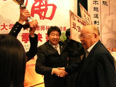 三辩刘欣东夺得最佳辩手。江平先生为最佳辩手和获胜方颁发奖杯和奖状。
