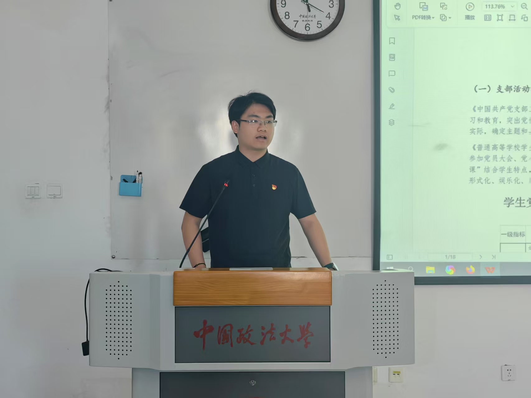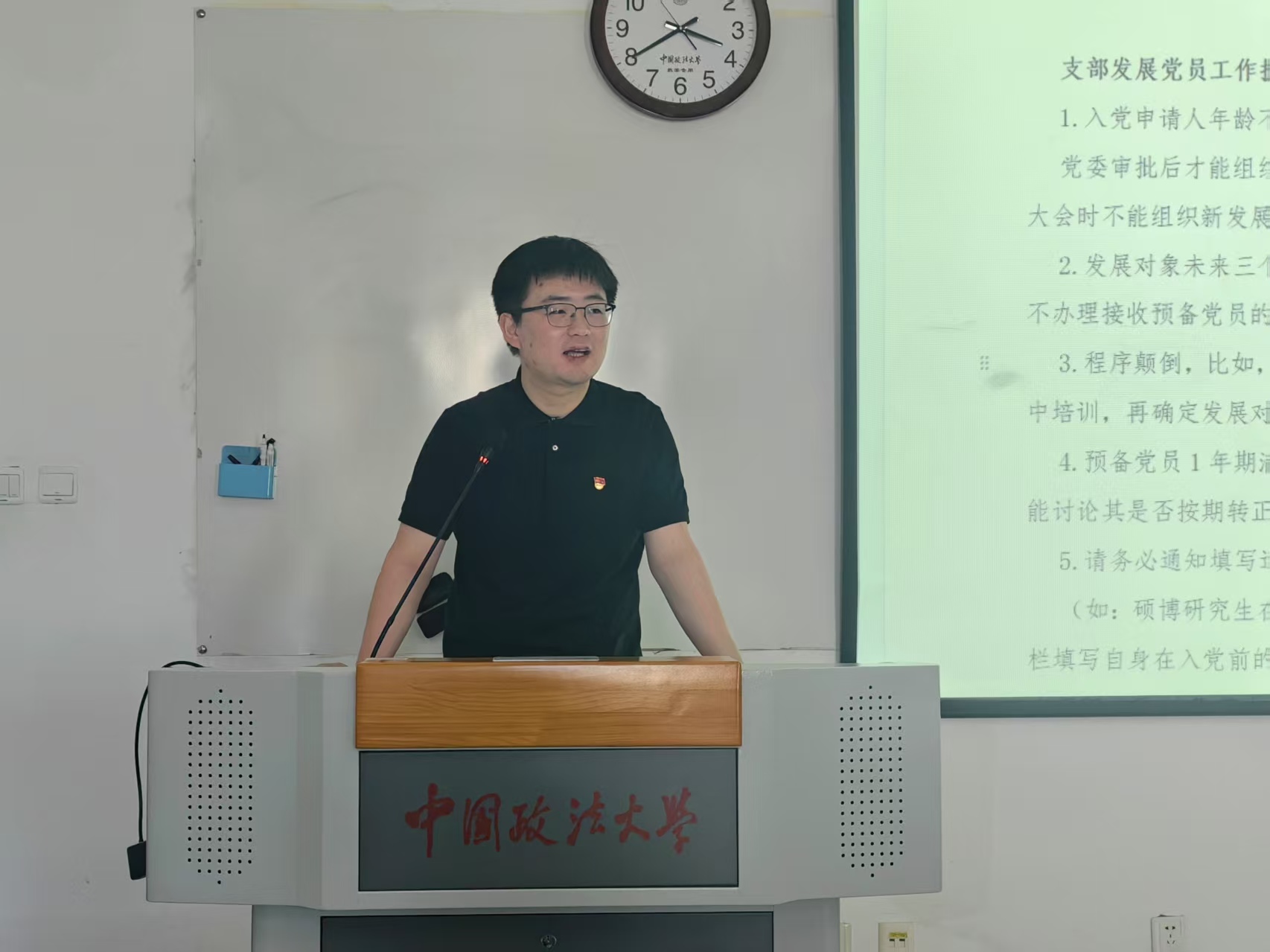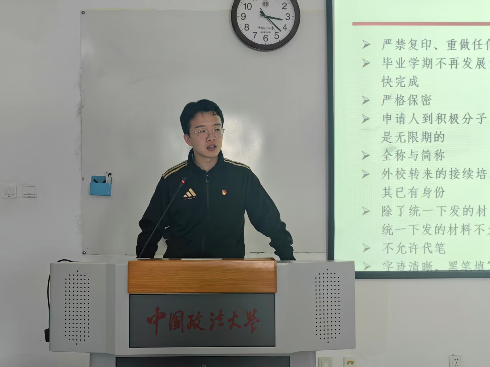 活动第三项,2022级法学实验班年级组织员万博洋和2023级硕博生年级组织员李鸿英讲解了党员发展工作流程的重点难点。万博洋梳理了从递交入党申请书到转正各阶段的时间轴和关键环节,包括党组织派人谈话、确定积极分子、发展对象、接收预备党员及转正等时间点,以及各阶段材料填写的规范要求。李鸿英就党员发展过程中的一些重点和易错点进行提示,包括材料易错、时间逻辑易错、毕业年级归档确认材料是否齐全等细节方面的问题。