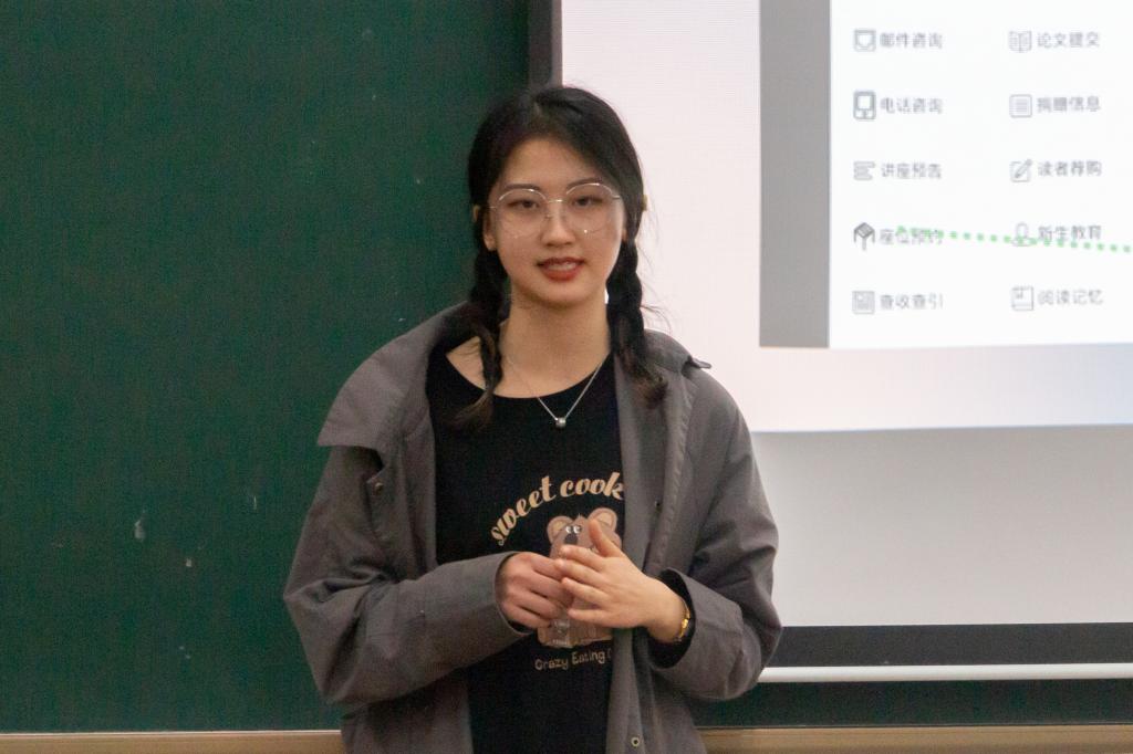 第一位分享经验的是张于晨同学。她从什么是经验说起,指出他人的意见并不等于个人的选择,并表示自己并非在传授经验,而是在分享有趣经历。随后她向同学们分享了一些信息资源,同时,她也为同学们们介绍了我校成绩和绩点的计算方法。在同学们较为迷惑的学习、社团、生活的平衡问题方面,她提到要建立自己的评价体系,按照事情的优先级妥善处理时间安排上的冲突。