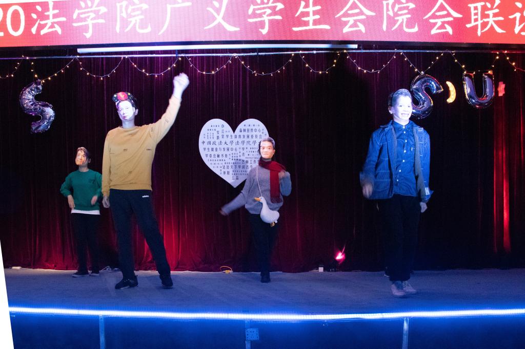 在冲击力极强的视频过后,学生就业与发展中心的节目《王浩然的全名叫啥我也不知道》以歌曲与独特精彩的短剧表演博得了全场欢呼;学生委员会秘书处的节目《关于我来到法大虽然发量少的无法原谅但依旧抵挡不住法学的诱惑决定让世界处处充满法这件事》引起在座同学的广泛认同与赞扬。办公室将柔和的音乐旋律、富有创意的舞蹈和悠扬的歌声融为一体呈现出的节目《路过办公室,解谎亦消愁》,带给在座的同学们以无限的感动。