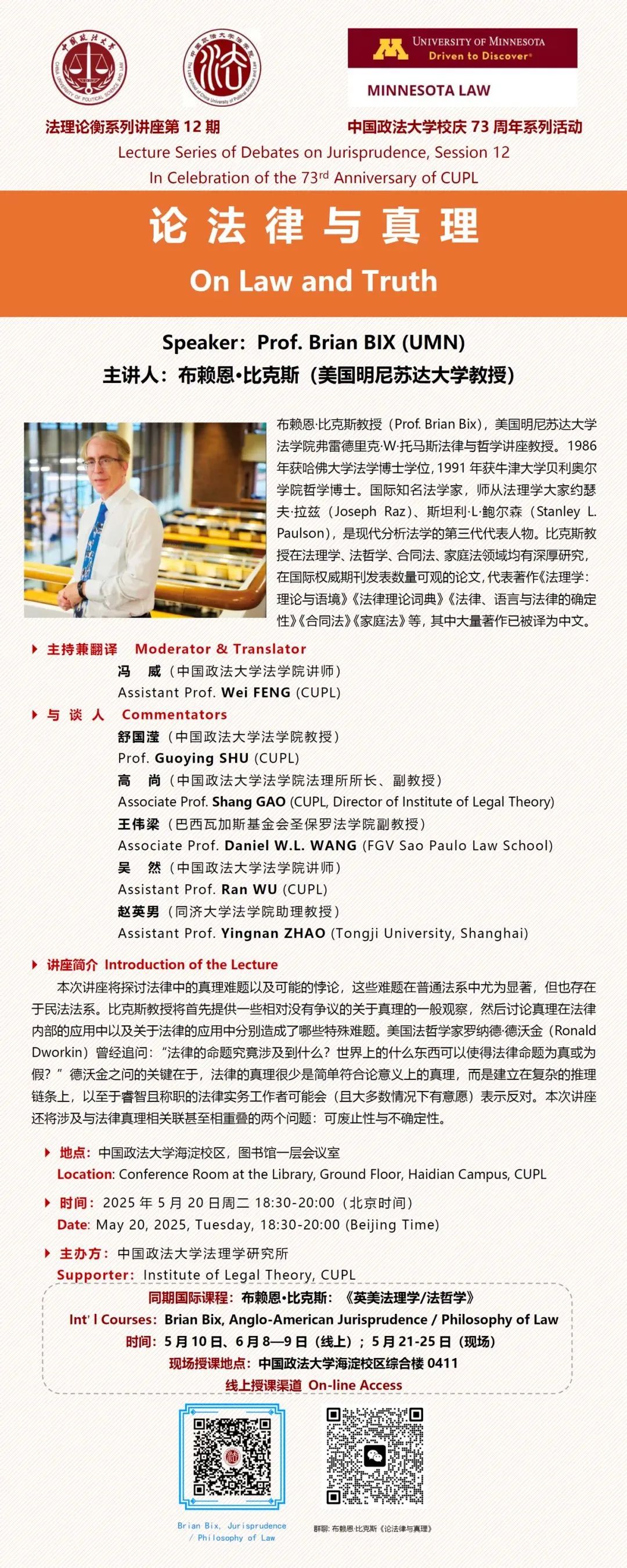 讲座简介:本次讲座将探讨法律中的真理难题以及可能的悖论,这些难题在普通法系中尤为显著,但也存在于民法法系。比克斯教授将首先提供一些相对没有争议的关于真理的一般观察,然后讨论真理在法律内部的应用中以及关于法律的应用中分别造成了哪些特殊难题。美国法哲学家罗纳德·德沃金(Ronald Dworkin)曾经追问:“法律的命题究竟涉及到什么?世界上的什么东西可以使得法律命题为真或为假?”德沃金之问的关键在于,法律的真理很少是简单符合论意义上的真理,而是建立在复杂的推理链条上,以至于睿智且称职的法律实务工作者可能会(且大多数情况下有意愿)表示反对。本次讲座还将涉及与法律真理相关联甚至相重叠的两个问题:可废止性与不确定性。