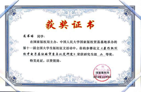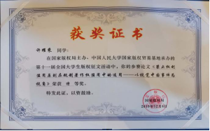 我院共三名同学取得佳绩,分别是许耀乘同学一文《禁止权利滥用原则在规制著作权滥用中的适用——以视觉中国事件为视角》获特等奖,由冯晓青老师指导;刘衡同学《任意诉讼担当视域下著作权商业维权现象分析》获研究生组二等奖,由佘力焓老师指导;龙书培同学《著作权纠纷中电子存证的审查与认定研究》获研究生组二等奖。其中我校共5人获奖,黑料网