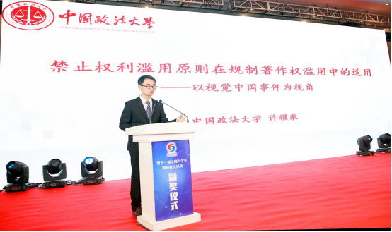 获奖同学3名,占比60%,其中特等奖获得者许耀乘同学以《禁止权利滥用原则在规制著作权滥用中的适用——以视觉中国事件为视角》为题作为本次研讨会的主旨演讲人之一,在会议现场发表了自己的看法。