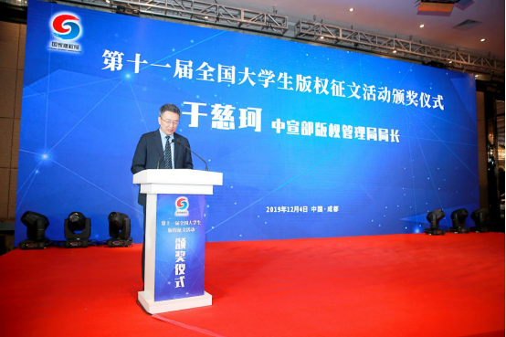 12月4日恰逢国家宪法日和全国法制宣传日,由国家版权局主办的第十一届全国大学生版权征文活动颁奖仪式在成都举行。中宣部版权管理局局长于慈珂,中共四川省委宣传部副部长、四川省版权局局长周青,中共四川省委教育工委副书记、教育厅党组成员李光华,安徽省教育厅副厅长储常连,成都市委宣传部副部长、市版权局局长师江,中国人民大学原校长助理、新闻学院院长倪宁教授以及法官、业界精英、高校师生等二百余人出席颁奖。