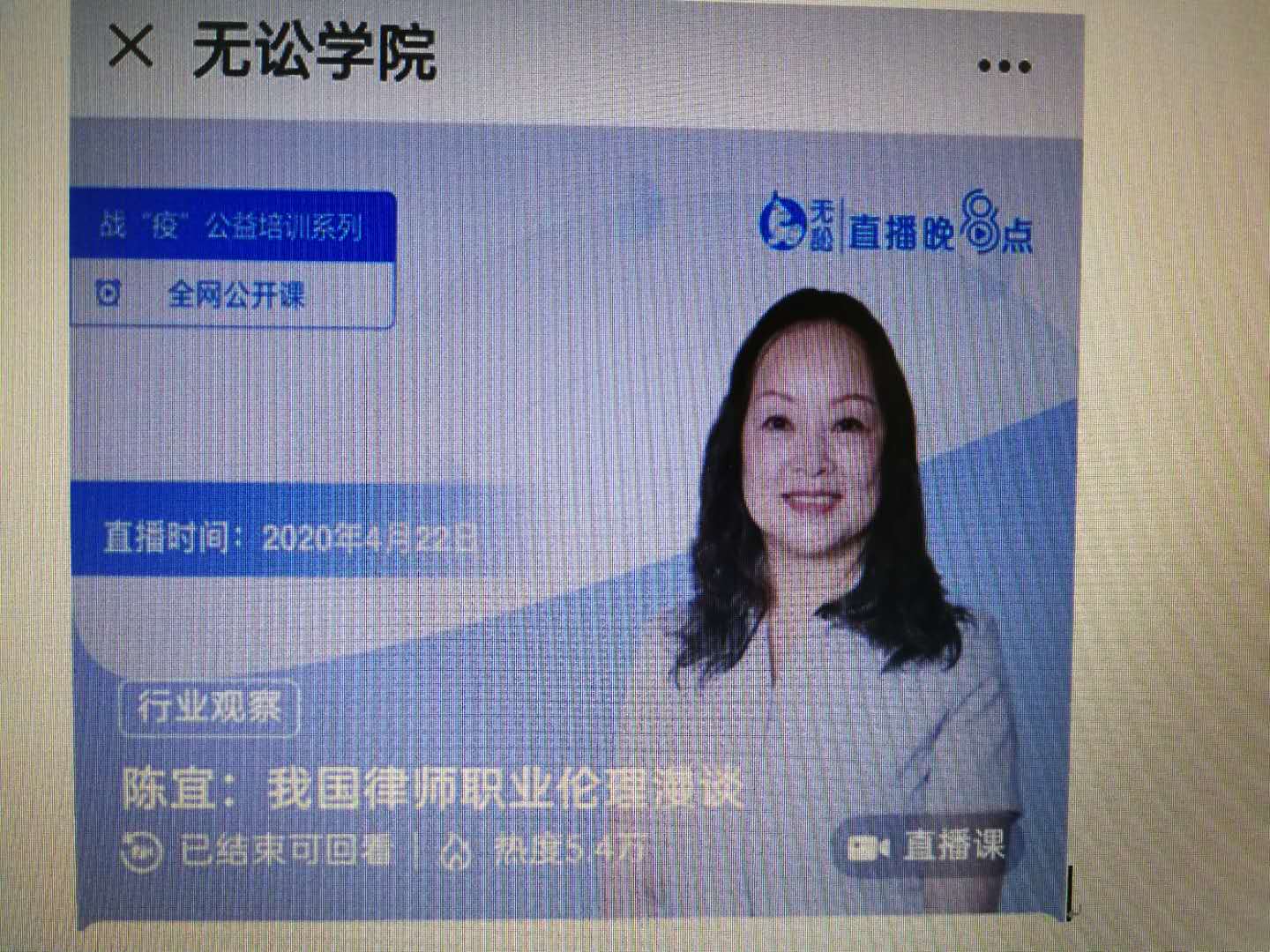 2020422日晚,我院陈宜教授应无讼学院邀请,做了一场《我国律师职业伦理漫谈》的公益直播讲座。陈宜教授从律师职业伦理与职业责任、我国律师职业伦理的前世今生、我国律师职业伦理存在的问题、两结合管理体制下的律师职业伦理建设、我国律师职业伦理展望等方面,分享了自己的心得并与学员互动,2万余人在线,获参会者好评。