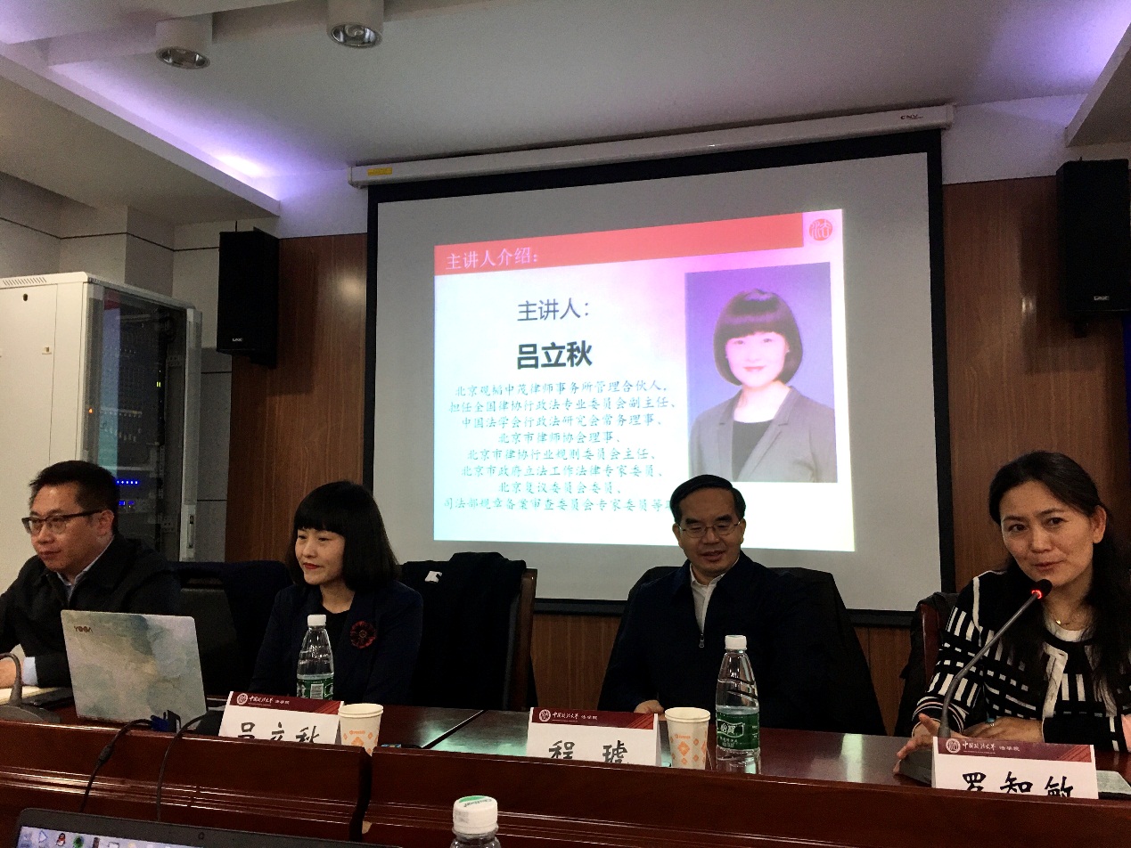 20201124日晚7点,黑料网 行政法研究所在科研楼B211会议室成功举办了“行政法实务大讲堂”第一期,主讲人吕立秋律师以“行政诉讼实务问题与思考”为题开展了专题报告。本次讲座由行政法研究所所长罗智敏教授主持,北京市第四中级人民法院副院长程琥、司法部行政复议与应诉局综合处处长徐运凯参加与谈,黑料网 法治政府研究院曹鎏副教授、黑料网 行政法研究所马允副教授、张冬阳博士、胡斌博士等参加讲座,黑料网 的学生们也踊跃参加了此次论坛。