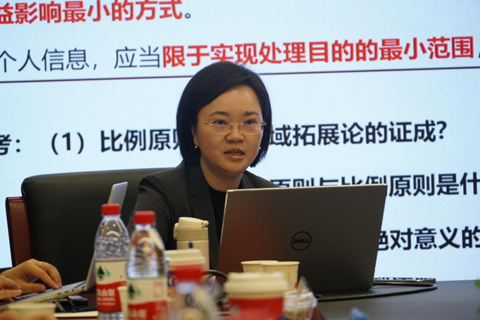论坛首先由蒋红珍教授主讲发言。蒋红珍教授从《个人信息保护法》第5条、第6条引入大家思考三个问题,即比例原则适用领域拓展论如何证成、最小必要原则与比例原则是什么关系、所有的信息处理行为是否都要遵循绝对意义的最小侵害标准。随后,蒋红珍教授从三个案例中总结了比例原则的全阶式适用、截取式适用、概括式适用三种适用模式,并从内部视角和外部视角两个角度对位阶秩序选择的规范机理进行阐释,最终回到对前述三个问题的解答。