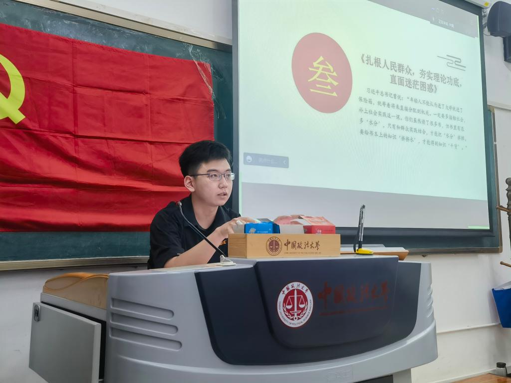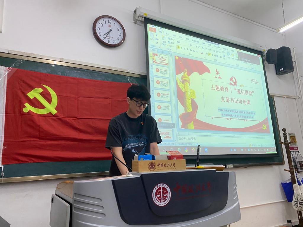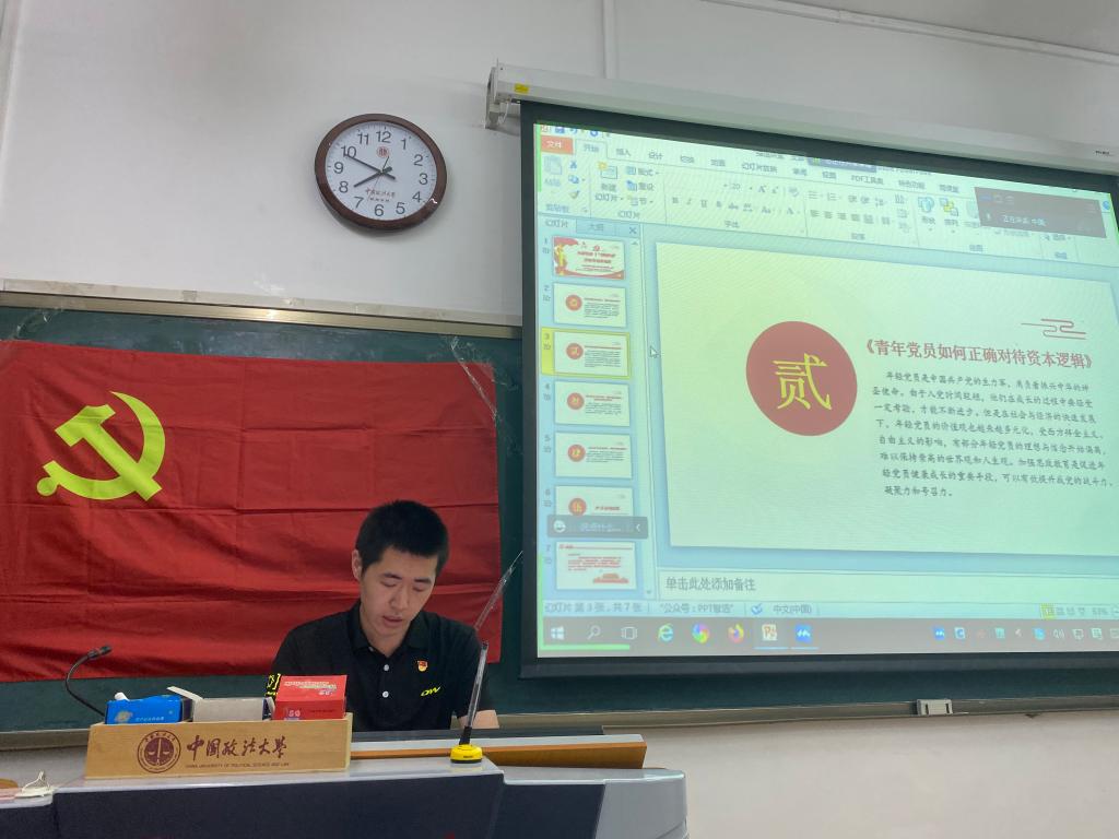 1902党支部书记方彦博同志做主题名为《青年党员如何正确对待资本逻辑》的党课发言。如何在资本的潮流之下不忘初心、砥砺前行,是每个青年党员都需要思考的问题。方彦博同志认为,我们要正确对待成败得失、严格节制欲望欲求和坚定捍卫理想信念,认真学习马克思主义相关理论,方能坚定信念、固守本心。
