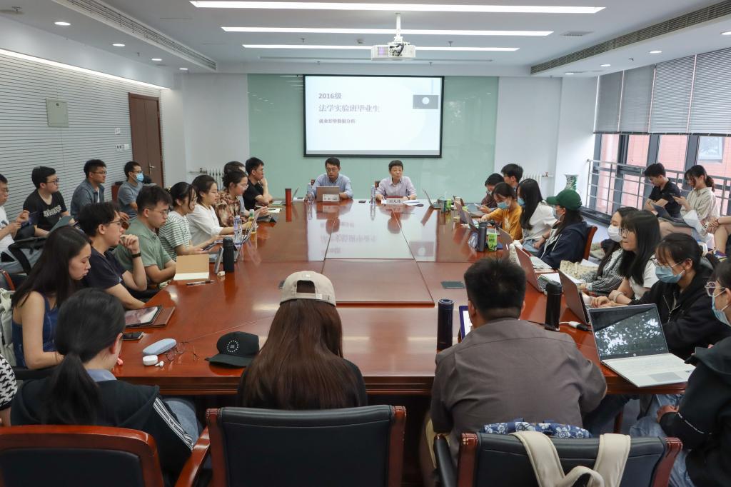 第二环节,刘大炜书记与学生代表针对职业发展问题进行座谈。首先,孙毅老师基于16和17级实验班毕业生就业数据的统计分析,指出就业方向呈现多元化发展趋势,希望同学们以终为始,根据就业需求和自身特点合理规划时间安排,有效平衡学习、生活、实习以及论文等方面。随后,针对法学实验班学生关注的实习实践、培养方案、论文写作和求职就业等问题,与会学生代表在汇总各班各年级意见基础上,提出了重点问题和意见建议。刘大炜书记对上述问题进行了解答和交流,并汇总形成意见和建议清单,指出将根据本次调研成果不断推进学院相关工作,并对同学们的未来发展表示祝福与展望。