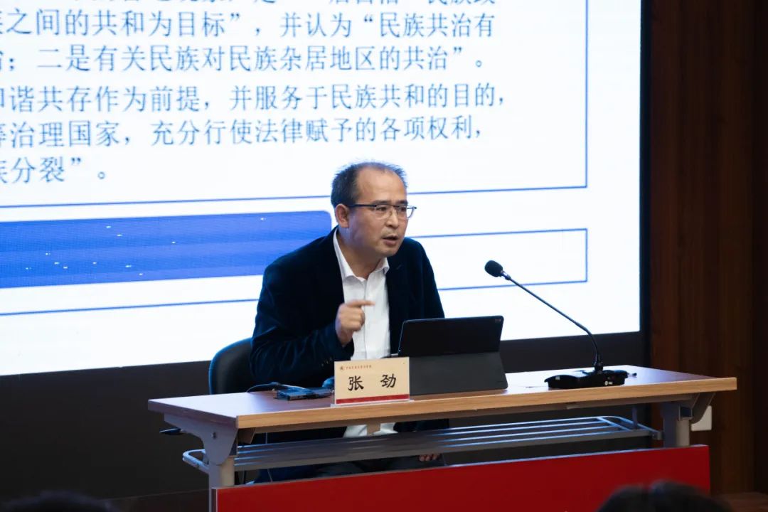 张劲以“宪法上的‘民族’话语表达及其内在逻辑——以82年宪法为中心”为主题讲授思政课。张劲从宪法角度出发,强调了民族问题在宪法中的重要性,并结合当今现状,提出民族工作的创新发展需要坚持切实保障各民族的合法权益。他进一步指出,要把握好共同体和差异性的关系,把握好中华民族共同体和各民族意识的关系,把握好故事和精神的关系。