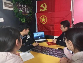 1月11日下午,1602班小铃铛龚超宇、王静伟、李瑞淇和小青团卢佳帆、陈小飞、方立一行六人抵达辽宁省沈阳市。冬日的沈阳,夜幕落下得匆忙,大家短暂进餐后,便在下榻的民宿中布置学习会场。鲜红的党旗悬挂在大厅墙面中央,庄严肃穆,团旗悬挂在党旗下方,象征着“党建带团建,团建促党建,党团共建齐发展”的活动宗旨。