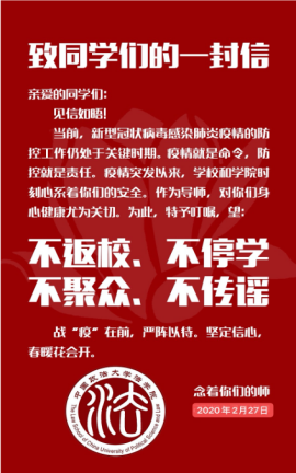 After the outbreak of the epidemic, Law school graduate work office immediately issued the notice to guide graduate students to prevent the epidemic in a scientific way, and then issued a proposal calling on the tutors to guide the graduate students not to return to school nor stop studying.