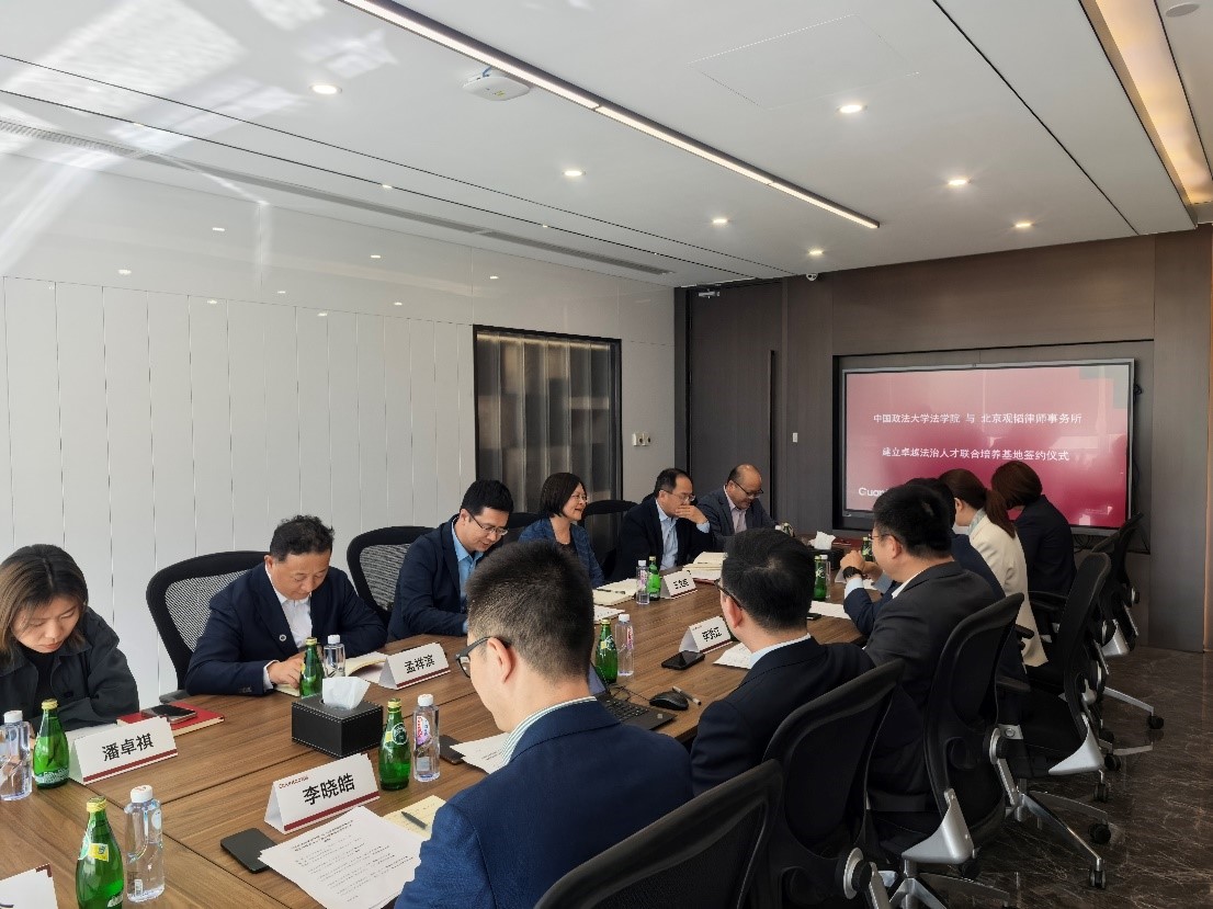 党委书记王文英、副院长张力、姚国建、团委书记孟祥滨、研工办主任管晓立、教科办主任潘卓祺,北京观韬律师事务所创始合伙人、管理委员会主任崔利国、党委副书记王阳、执行委员会委员李洪江、陈晓窗、国际投资与贸易部合伙人王梓、李晓皓、人力资源部主管李念共同出席了会议。