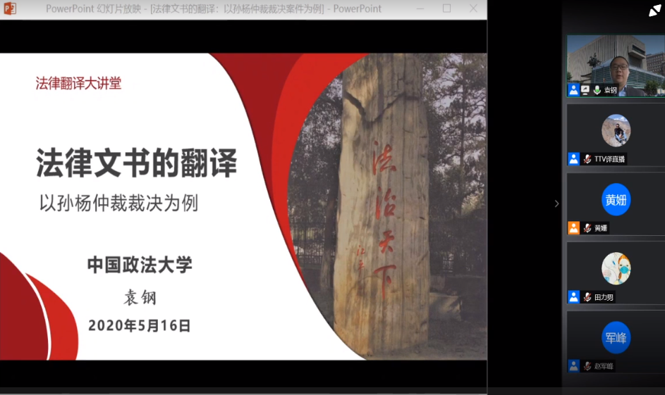 袁钢教授应“法律翻译大讲堂”邀请担任主讲专家,介绍涉外法治人才培养的背景,重点讲解法律文书翻译中育法特点、句法特点和专用术语;从个人和团队两个方面来介绍做好法律文书翻译的准备;以孙杨仲裁裁决为例,分析法律文书的翻译中四个原则,即遵循原文条纹、遵照法律表达、遵从惯习和官方文件、遵奉质量至上。约500人在线观看,讲座结束后袁钢教授也回答了在线观众的提问,重点回答如何做好法律翻译人才培养问题。袁钢教授也在线分享了孙杨仲裁裁决案件的中文版(//heilinfo.com/info/1609/10016.htm)。获取该次讲座课件和视频资料可以访问以下地址://ttv.cn/archives/9793。