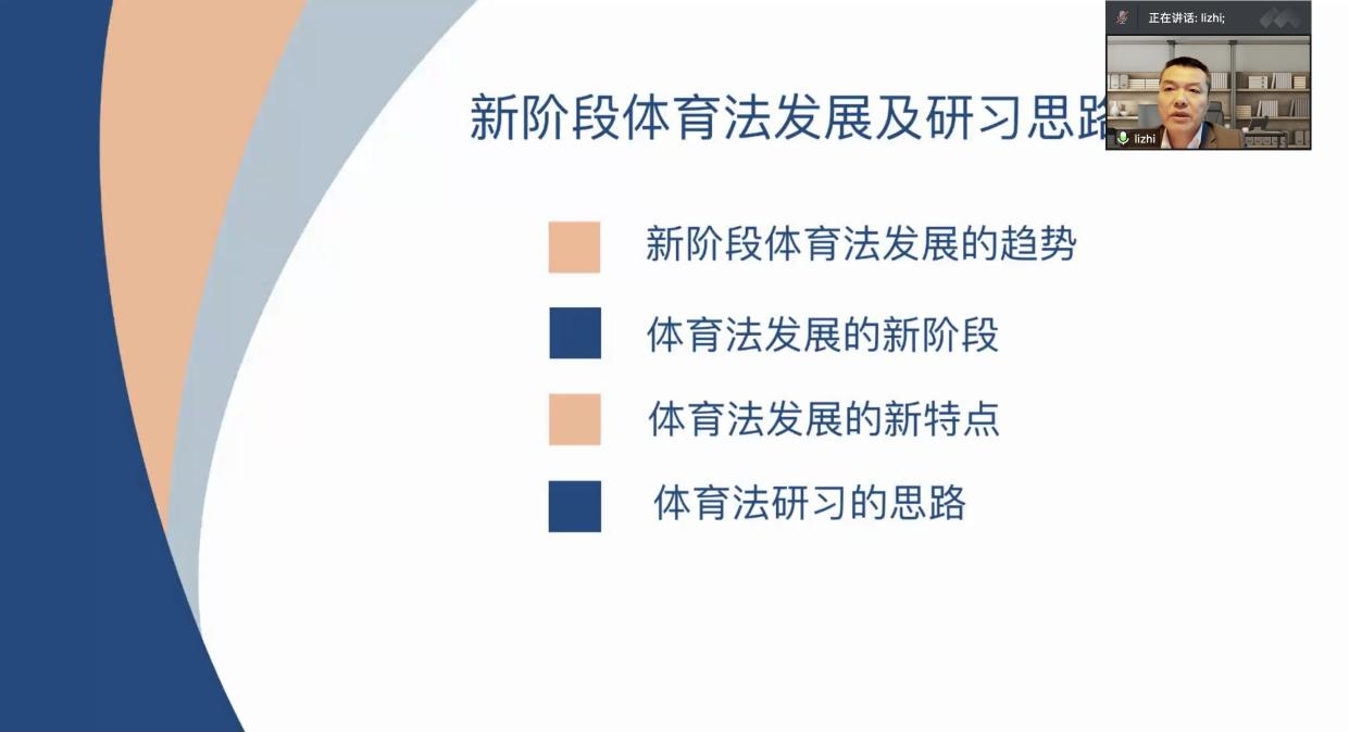 李智教授紧扣本次讲座主题,从新阶段体育法发展的趋势、体育法发展的新阶段、体育法发展的新特点、体育法研习的思路四个方面进行了细致讲解。