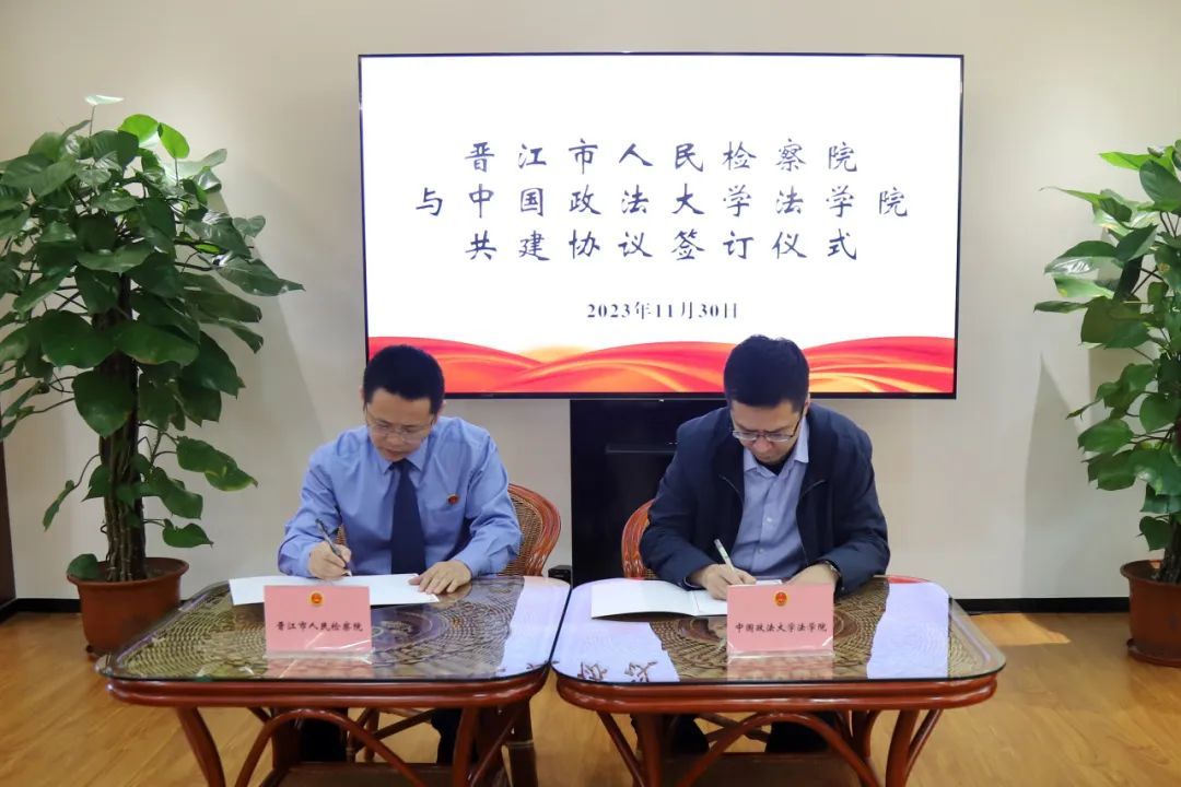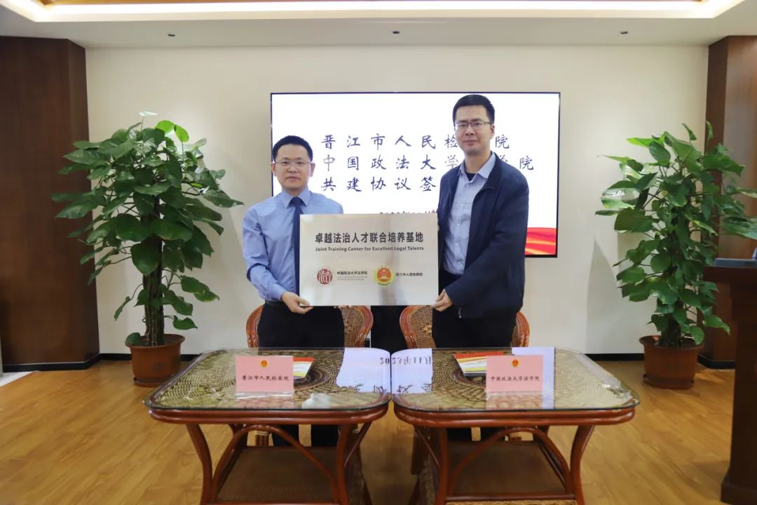 与晋江市人民检察院建立卓越法治人才联合培养基地协议书》。张力副院长向晋江市检察院授“卓越法治人才联合培养基地”牌。